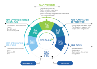 AZAP4.0 se compose de 5 modules conçus pour être intuitifs sur le plan de l’ergonomie de ses écrans personnalisables et de sa navigation. . Vous travaillez à partir d’un système intégré pour aligner les organisations sur les priorités de votre Supply Chain. En premier lieu, améliorer la visibilité, mais aussi la réactivité et la productivité, depuis vos fournisseurs jusqu’aux magasins/points de ventes.